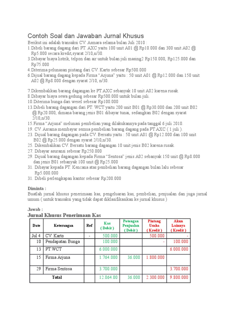 Contoh Soal Dan Jawaban Jurnal Khusus Penerimaan Kas Bali Teacher from lh6.googleusercontent.com Peranan larutan penyangga dalam tubuh makhluk hidup dan contohnya. Jurnal khusus (special journal) yang digunakan di perusahaan dagang pada umumnya terdiri dari 4 macam, diantaranya itulah tadi pembahasan contoh jurnal khusus perusahaan dagang. Khusus untuk transaksi bank charges dan interest income dicatat di …. Siswa kelas x, xi dan xii sekolah tersebut. Dilihat dari sudut fungsinya, akuntasi diartikan sebagai…. Soal pilihan ganda beserta jawabannya 5 soal essay teks eksplanasi resensi buku cerdas berbahasa indonesia untuk smama kelas xi ceramah indera penciuman tidak aktif saat tidur recent comments. Pada artikel kali ini membahas tentang soal ujian pilihan ganda penjaskes untuk kelas 12 beserta jawabannya, semester 2. 50 soal pilihan ganda tentang akuntansi beserta jawabannya.